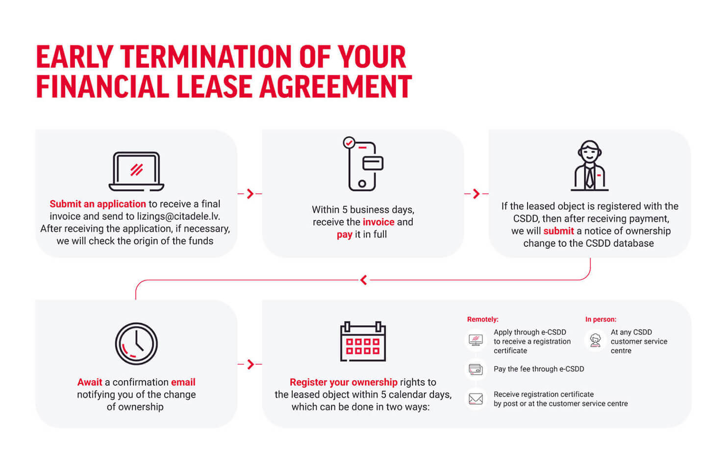 - Once payment for your final invoice has been received, Citadele Leasing will add an electronic alienation mark to the leased object in the CSDD system to indicate that ownership rights have been transferred.